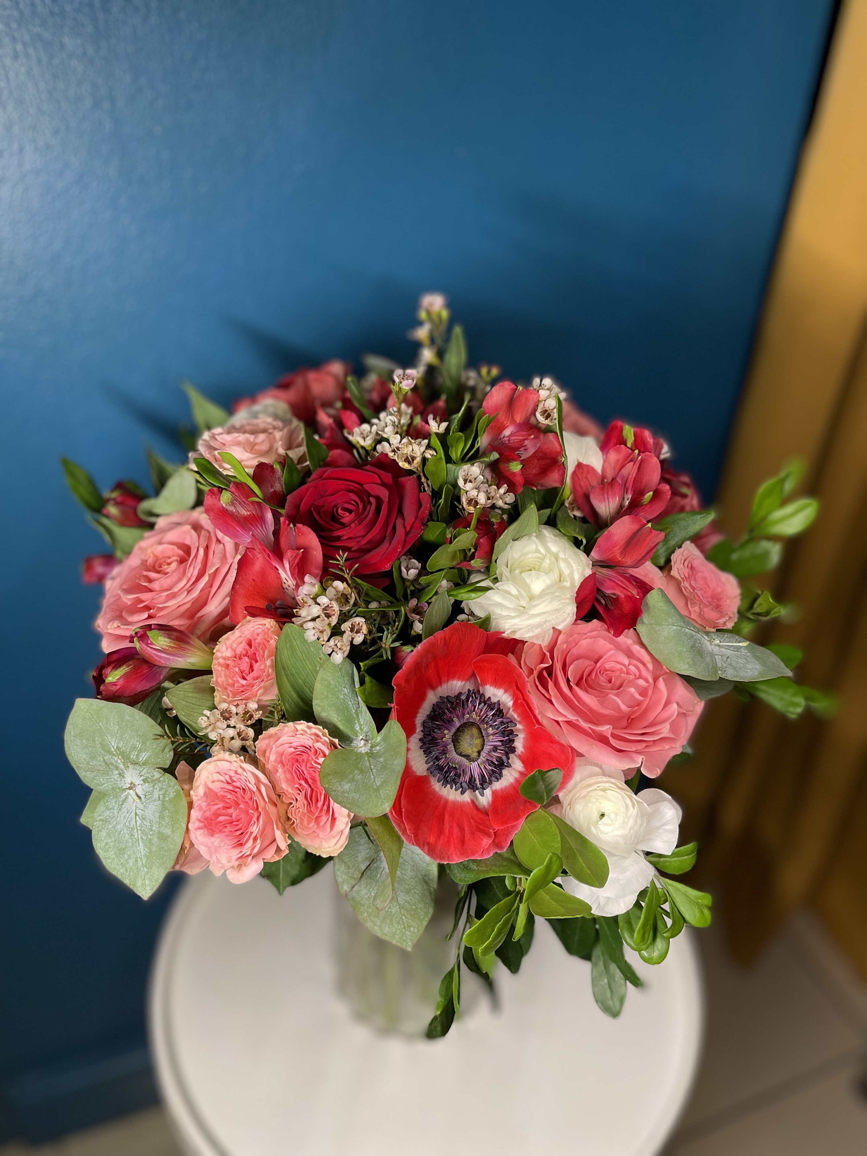 Surprenez votre moitié avec un bouquet enchanteur, mêlant la délicatesse des anémones, la passion des roses rouges et l'élégance des renoncules. Un cadeau parfait pour exprimer votre amour éternel.